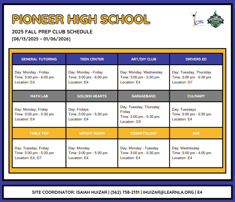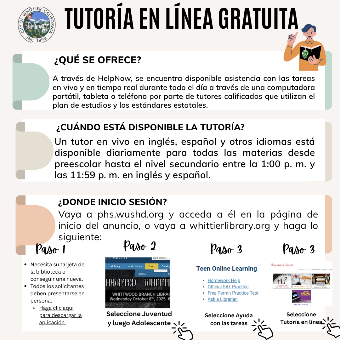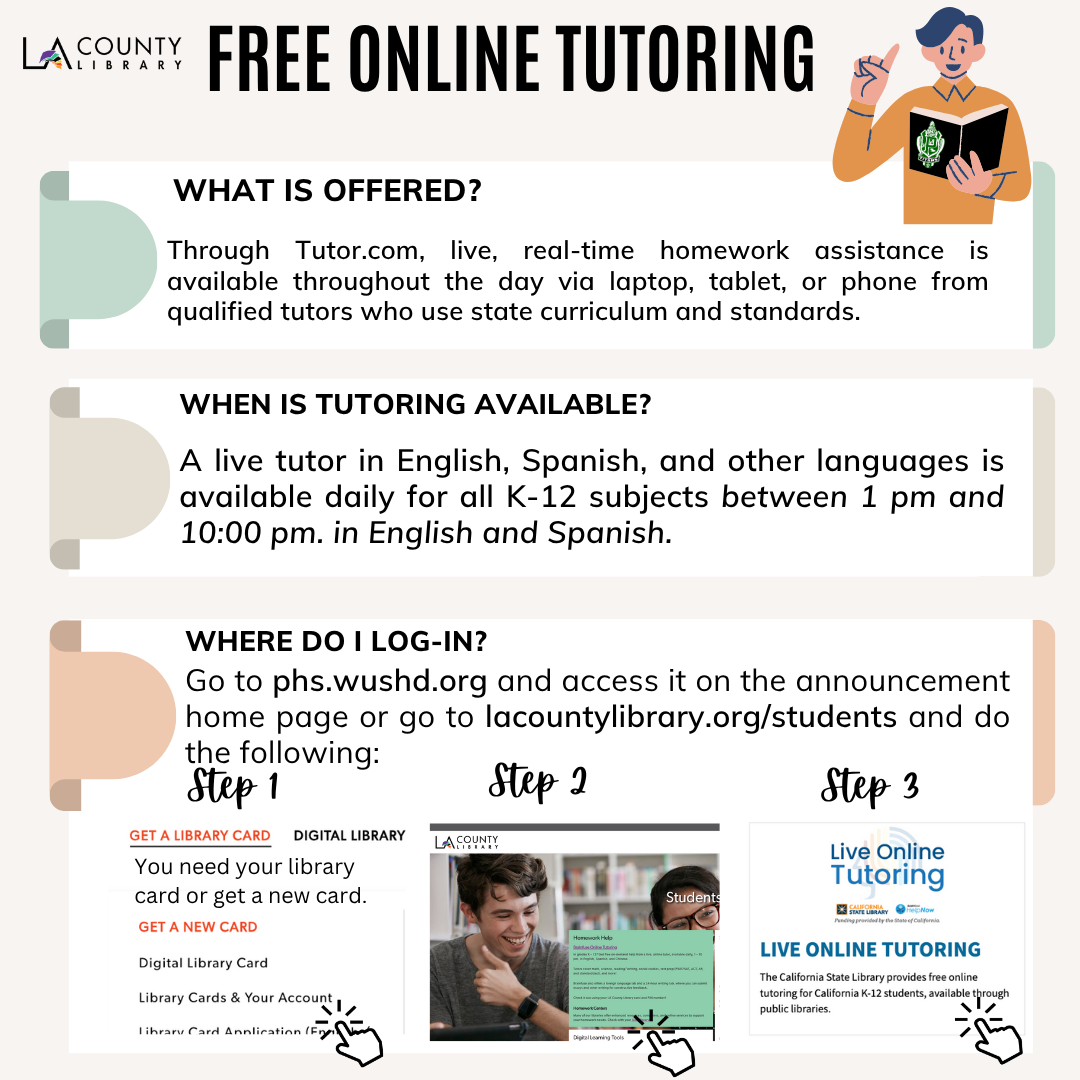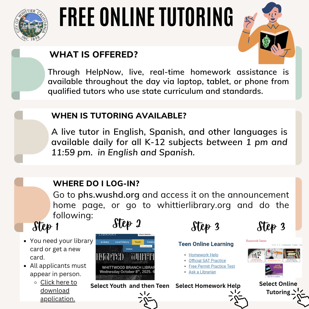 Free Tutoring for Pioneer High School Students/Tutoría Gratuita para Estudiantes de Pioneer High School ✅ On-Campus Tutoring: PREP Program 📍 Location: Room E4 🗓 Monday – Friday ⏰ 3:00 – 5:30 p.m.Students can get help in all subjects, especially Algebra 1 and Biology. ✅ Online Tutoring: LA County Library Available through Tutor.com 📚 Subjects: Math, Science, English, Social Studies, Essay Review, and more 🌎 Languages: English, Spanish, and others ⏰ Daily from 1:00 – 10:00 p.m. 🔑 A library card is required (apply online or at any LA County Library branch) 🌐 LA County Library Online Tutoring ✅ Online Tutoring: Whittier Public Library Available through HelpNow 📚 Subjects: All K–12 subjects and essay review 🌎 Languages: English and Spanish ⏰ Daily from 1:00 – 11:59 p.m. 🔑 A Whittier Public Library card is required (application must be completed in person) 🌐 Whittier Public Library Online Tutoring 📌 How to Access Students can log in with their library card through the library websites, or find the links directly on the PHS website homepage. With these three services, every Titan has the opportunity to get help, build skills, and succeed in school! 📘 Tutoría Gratuita para Estudiantes de Pioneer High School En Pioneer High School queremos que cada Titán tenga las herramientas para tener éxito. Los estudiantes tienen acceso a tres servicios gratuitos de tutoría — en la escuela y en línea. ✅ Tutoría en la Escuela: Programa PREP 📍 Lugar: Salón E4 🗓 Lunes – Viernes ⏰ 3:00 – 5:30 p.m.Los estudiantes pueden recibir ayuda en todas las materias, especialmente en Álgebra 1 y Biología. ✅ Tutoría en Línea: Biblioteca del Condado de Los Ángeles Disponible a través de Tutor.com 📚 Materias: Matemáticas, Ciencias, Inglés, Estudios Sociales, Revisión de Ensayos y más 🌎 Idiomas: Inglés, Español y otros ⏰ Todos los días de 1:00 – 10:00 p.m. 🔑 Se requiere tarjeta de la biblioteca (solicite en línea o en cualquier sucursal del Condado de Los Ángeles) 🌐 Biblioteca del Condado de Los Ángeles – Tutoría en Línea ✅ Tutoría en Línea: Biblioteca Pública de Whittier Disponible a través de HelpNow 📚 Materias: Todas las materias K–12 y revisión de ensayos 🌎 Idiomas: Inglés y Español ⏰ Todos los días de 1:00 – 11:59 p.m. 🔑 Se requiere tarjeta de la Biblioteca de Whittier (la solicitud debe completarse en persona) 🌐 Biblioteca Pública de Whittier – Tutoría en Línea 📌 Cómo Acceder Los estudiantes pueden ingresar con su tarjeta de la biblioteca a través de los sitios web de las bibliotecas, o encontrar los enlaces directamente en la página principal del sitio web de PHS. Con estos tres servicios, ¡cada Titán tiene la oportunidad de recibir ayuda, fortalecer sus habilidades y tener éxito en la escuela! Attached Files Free Online Tutoring 2025.pdf