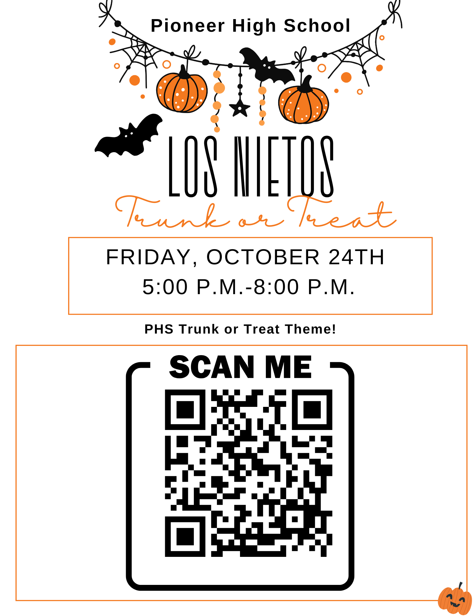 ๐ Titans, We Need You! The Titan Family is spreading fall cheer and community spirit this October โ and we need your help to make it happen! Click here to participate! Weโre partnering with our local elementary schools for their annual Trunk or Treat and Harvest Festival celebrations. Letโs show our Pioneer pride and make a difference in our community! ๐ฌ Los Nietos Trunk or Treat๐ Friday, October 24 | 5:00โ8:00 p.m.Join us as we host a โBeetlejuiceโ-themed trunk at Los Nietos School! Families will enjoy games, candy, and Halloween fun โ and we need Titans to help make it a success.๐ฒ Scan the QR code on the flyer to sign up โ just a few spots left! ๐ Andrews School Harvest Festival๐ Thursday, October 24Volunteer alongside the Titan Family at Andrews Schoolโs fall celebration! Itโs a wonderful way to earn service hours, give back, and spread Titan pride.๐ฒ Scan the QR code to sign up and join the fun! ๐ Letโs represent Pioneer with smiles, costumes, and community spirit!Your time and energy make all the difference โ sign up today and help us bring the Titan spirit to our youngest future Titans!